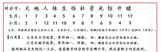 此法分利、明、时、天、地、阴、黑、人、风,周而复始论月不论节,依失物之日起例参断。大月从天向地字起顺数初一,小月从地字逆数,如遇失物之日即止,看逢何字,便知寻物难易以定有无,且看下诀: