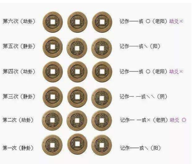 共摇六次,按顺序记录好铜钱背和字的情况,然后将之告诉预测师,预测师则会根据卦象显示,为你解答。