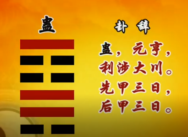 蛊卦卦辞:蛊,元亨。蛊怎么会元亨呢?腐败会元亨吗?生病会元亨吗?社会风气不好会元亨吗?那你就想另外一个角度:说一个人难免会生病,社会难免风气会变坏,事情很可能越来越糟,我们不是常讲三句话吗:人越来越老,事情越来越糟,东西越来越旧,这也是理所当然,势所必然,意思告诉我们说,腐败是难免的,你只要及时加以有效的整治,那你也是大亨通。可见《易经》给我们的是鼓励多于指责,给我们的是比较积极的一些想法,而避免把消极的观念始终放在脑海里面。