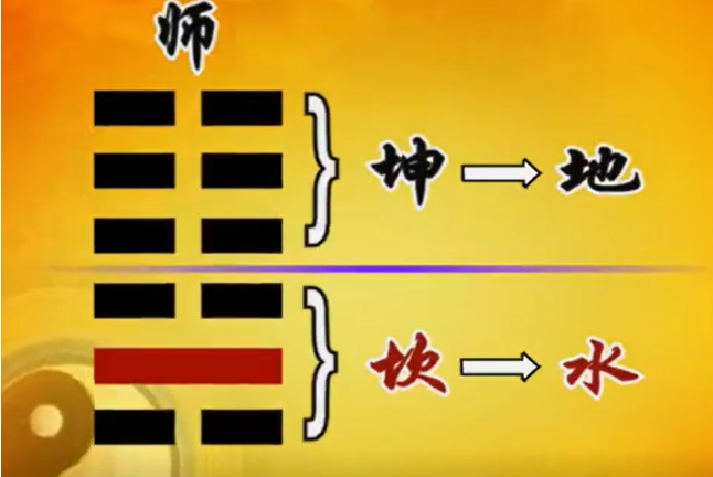 各位可以看到下卦是什么?下卦是坎卦,就是水;上卦是坤卦,就是地。地下有水,那水在地中好不好呢?我们要喝水,所以地里面有水,我们可以饮用。但是如果那个水是有毒的,那可能全家都一下子就毒死了。我们从这里可以体会到,战争不完全是坏事,它可能是好事。所以,我们从现在的演变可以了解到“师”这个字,刚开始它有正面的意义叫做以战止战,那么现在的人更应该了解,看到师就要想到为和平而战。有了这样的认识,我们就可以放心的来看师卦的卦辞。