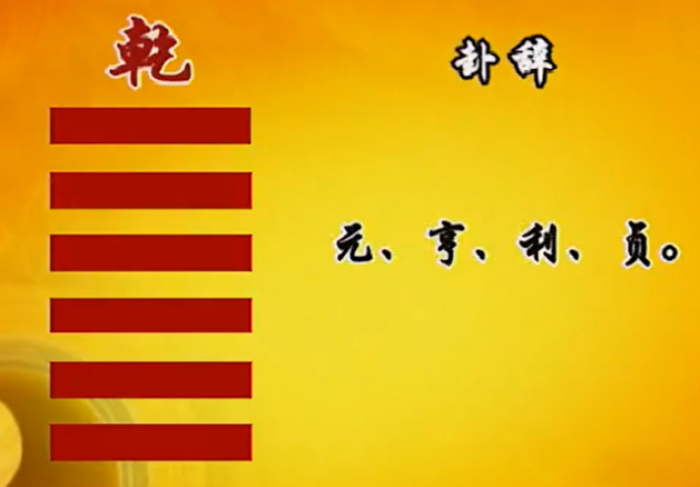 乾就是这卦的名称,叫做卦名。下面有一个符号,这个符号是六条没有间断的、连续的阳爻,这个是乾卦的卦象。下面元、亨、利、贞四个字就是解释前这个卦名的,所以叫做卦辞。