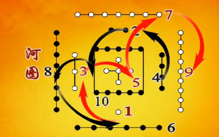 河图是太极生两仪,太极生出阴阳两种气,阴是逆时针的,阳是顺时针的。