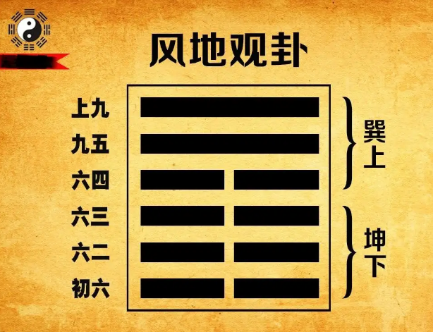《序卦传》说:“物大然后可观,故受之以观。”“观”是展示与仰观意思。这一卦所阐释的,是说要将道义,展示于众人之前,众人必然也对自己瞻仰的道理。“九五”在尊位,被四个阴爻瞻仰;“九五”也以中正的德性,展示于天下。所以命名为“观”。