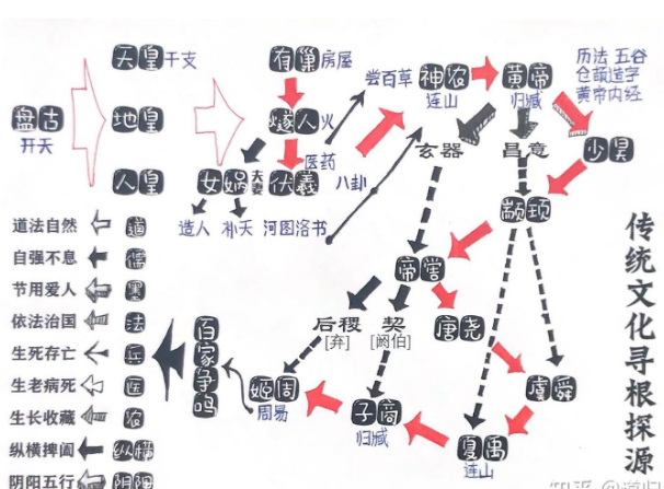按神化传说,我们人都女娲造的,正经讲我们被称为炎黄子孙。我们的文化是从炎帝神农氏、黄帝轩辕氏是那里传下来的,我们脚下这片土地,被称为华夏大地,中国的第一个王朝,是夏朝,地处中原,所以我们又叫中华儿女,华夏子孙。要去寻找我们文化的根源,那么就要弄明白它们之间是什么关系。答主画了这张关系图,来帮大家梳理一下,从盘古开天辟地,到诸子百家争鸣的文化传承过程:
