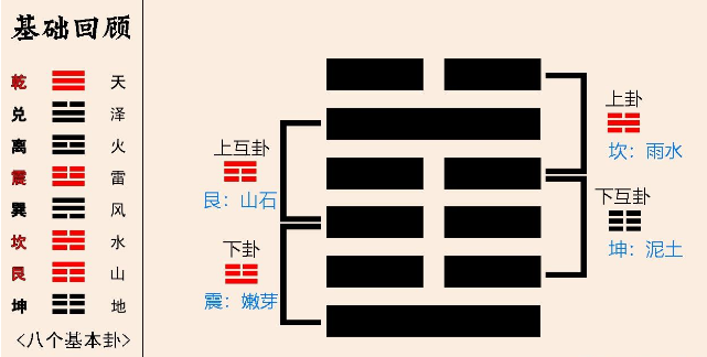 以卦的四象而言,分为 上卦:坎,上互卦:艮,下互卦:坤,下卦:震。这里需要注意的是,若以上下卦分,那么坎当作是云,若是四象分,那么就可以把坎理解为雨或者水。给大家画了一个图,便于理解卦的四象。
