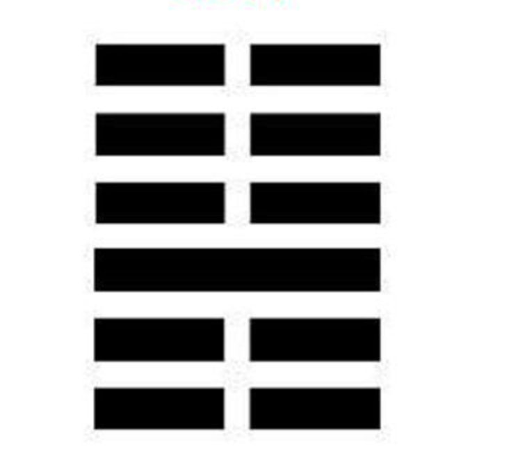 仍以谦卦为例,自下而上,观察它的各爻,会发现分别是:阴爻、阴爻、阳爻、阴爻、阴爻、阴爻。