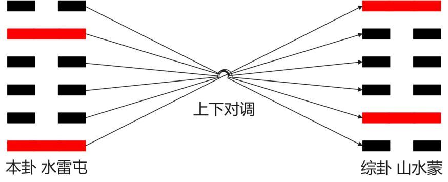 比如本卦水雷屯上下倒置过来就是山水蒙,如下图: