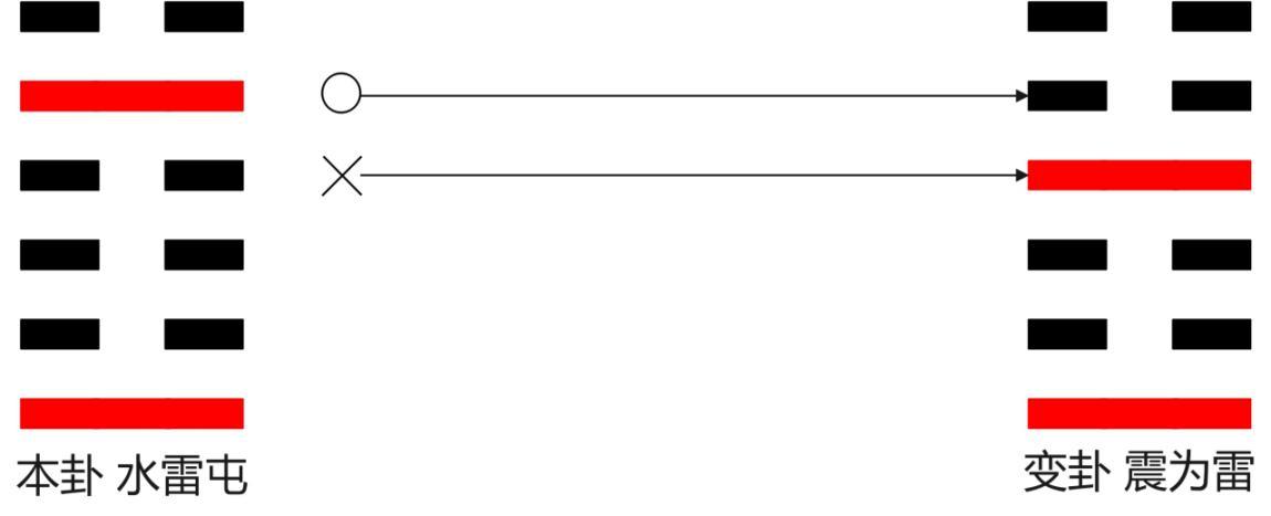 比如本卦水雷屯的第四爻与第五爻均发生阴阳变化,那么变卦就是震为雷。通常的书写习惯是阳爻发生变化用圆圈表示,阴爻发生变化用交叉表示,如下图所示: