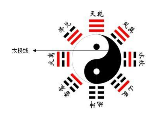 每次取三个爻,叠放在一起,可以重复取,根据乘法原理,就画出了三爻的乾兑离震巽坎艮坤八个卦。如下图所示这八个卦在先天八卦图中从乾卦开始逆时针旋转依次为乾兑离震四卦,然后沿着太极线返回到巽卦,再顺时针旋转依次为巽坎艮坤四卦,最后回到坤卦结束。先天八卦图以中间为核心向外看,中间黑白相间的圆形部分是阴阳鱼,黑白的分界线是太极线。先天八卦图中间开始没有阴阳鱼,是明朝的学者加上去的,说明随着时代的进步,《周易》也和其他知识融合并向前发展。